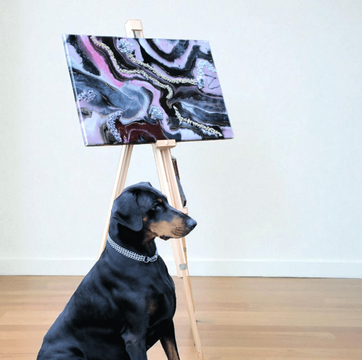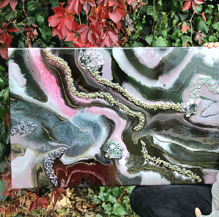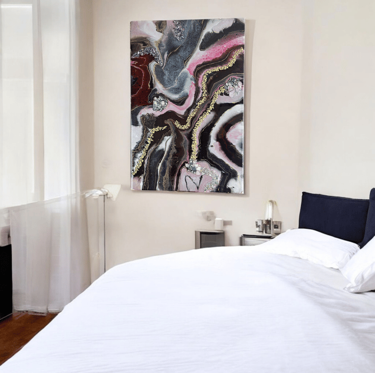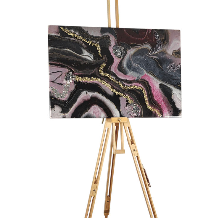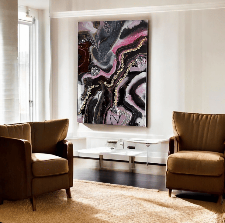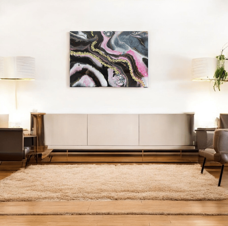 One‑of‑a‑kind resin artwork on MDF with flowing pink, black, and gold tones. Glossy finish and shimmering metallics bring bold, modern energy to any space