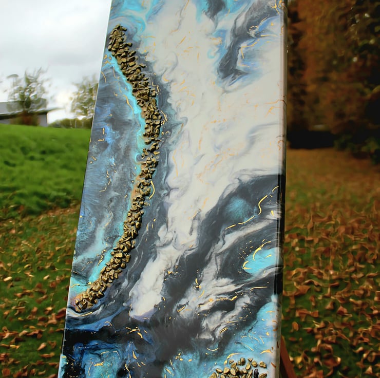 This original resin artwork is created on MDF board using flowing layers of black, pink, white and purple, with shimmering metallic gold accents that catch the light beautifully. The glossy resin finish enhances depth and movement, giving the piece a bold, contemporary feel.