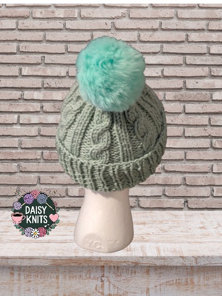 DESIGN FEATURES: Pale Green chunky cable knit beanie with a faux fur pom pom for stylish winter warmth