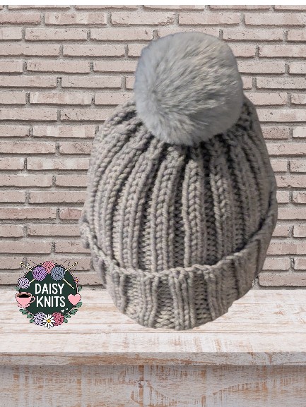 DESIGN FEATURES: Different shades of grey chunky knit beanie with a faux fur grey pom pom for stylish winter warmth