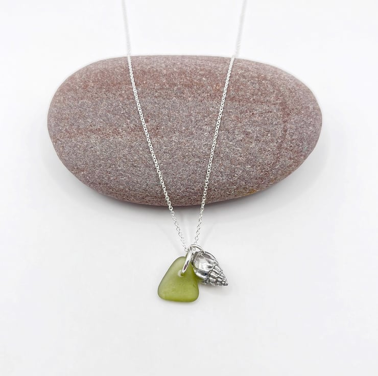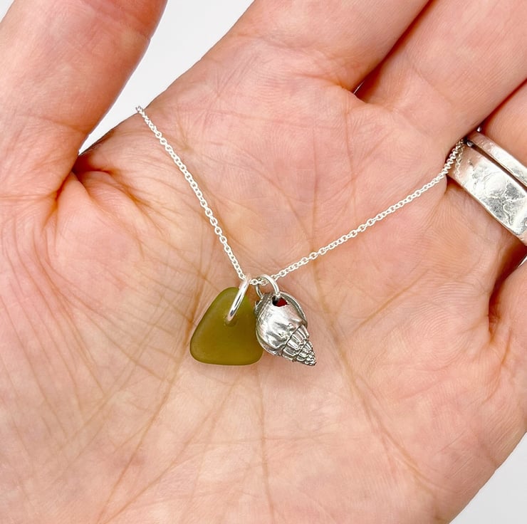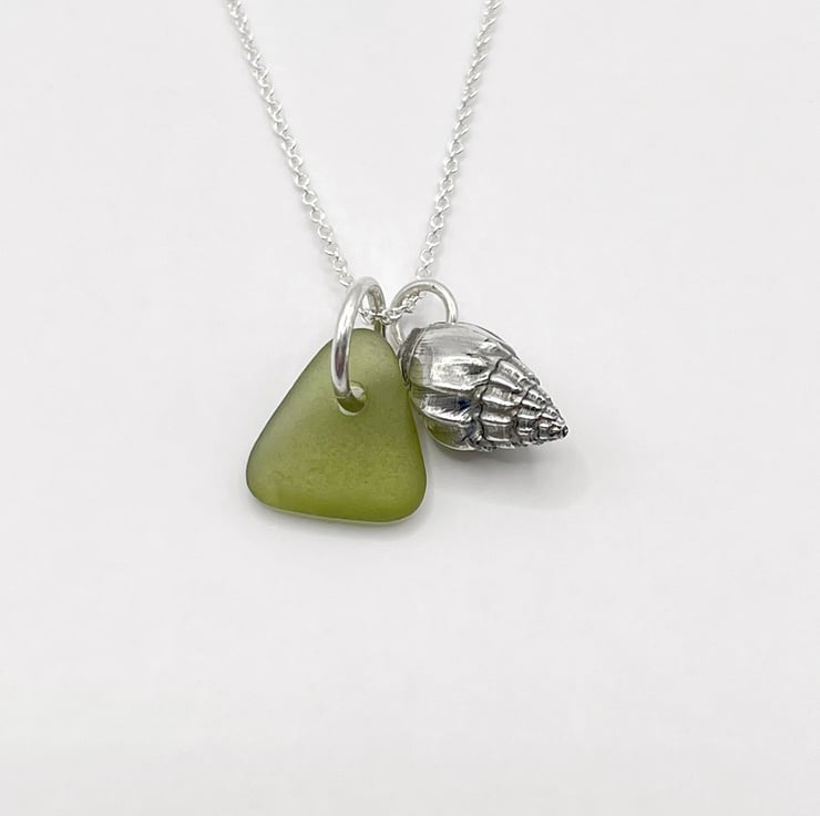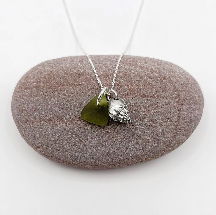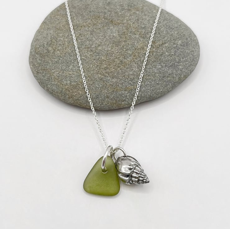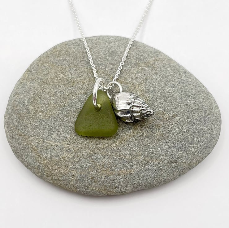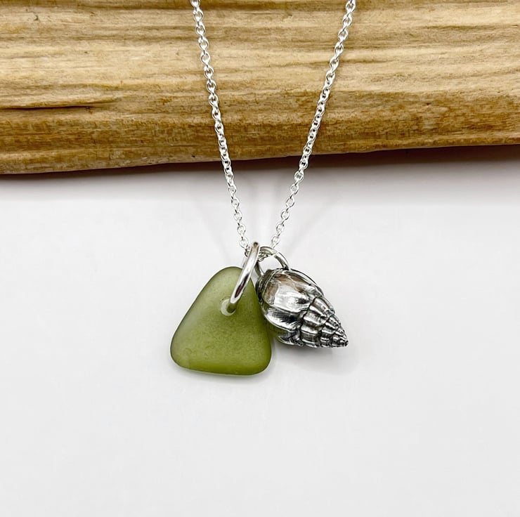 Piece of olive green coloured Cornish Sea Glass paired up with a Silver coated Little Bear Conch shell. I have added these on to an 18" Eco sterling silver fine chain necklace.