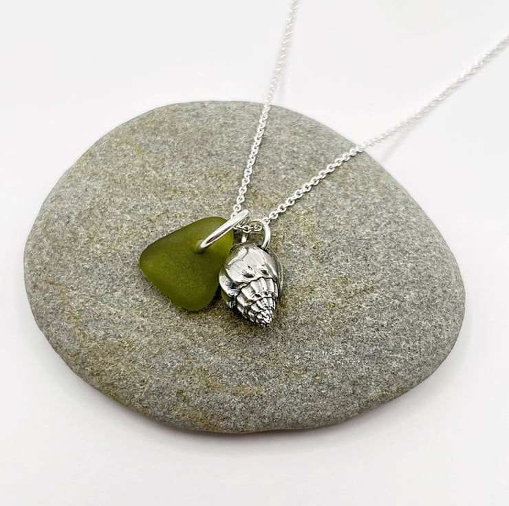 Cornish Sea Glass Necklace with Baby Bear Conch Shell - Olive