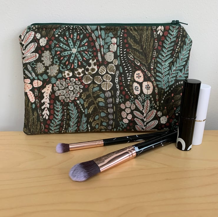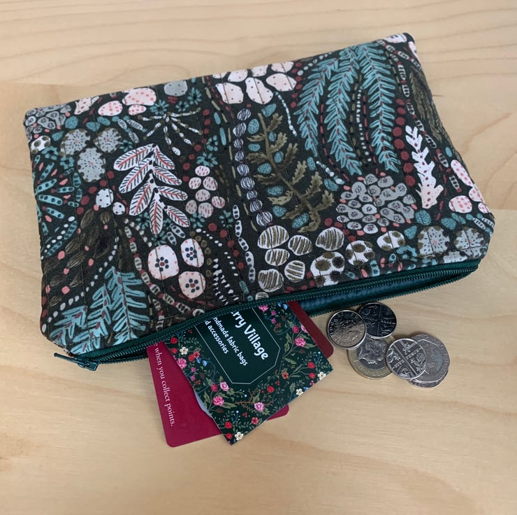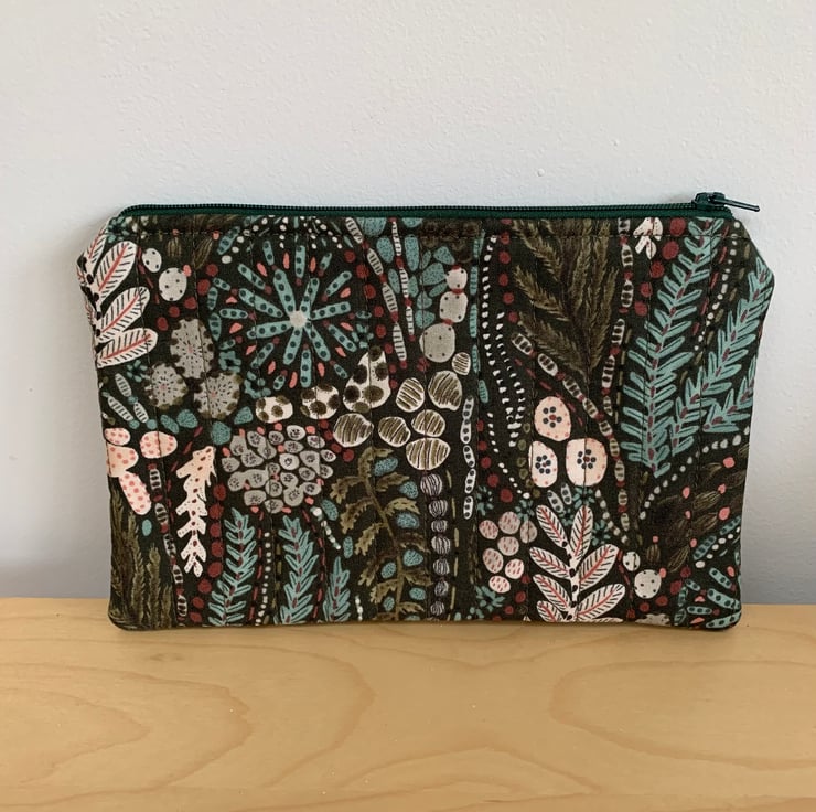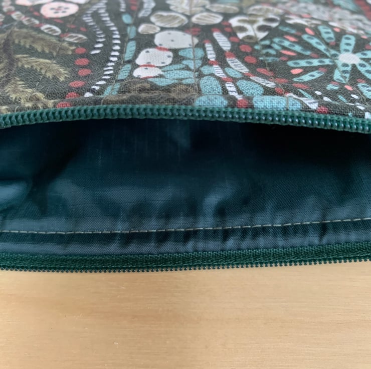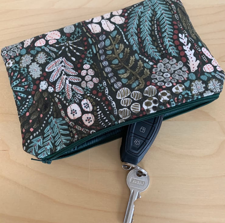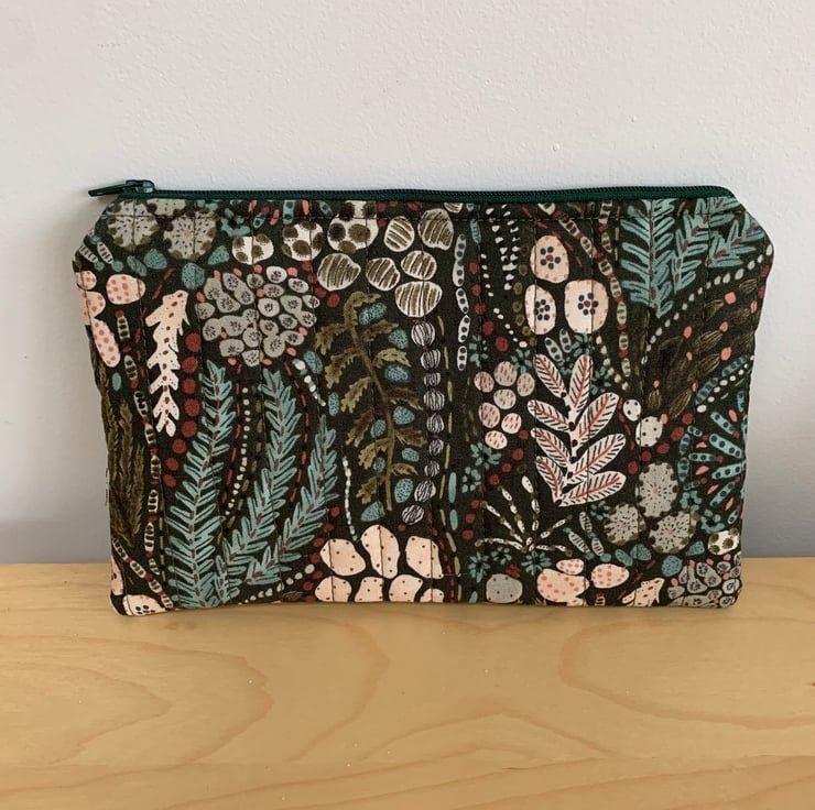 The pouch is made from quilted autumn colour nature print cotton on an olive green background with olive green stitching and a dark green zip. The pouch is fully lined with plain dark green water resistant ripstop fabric.