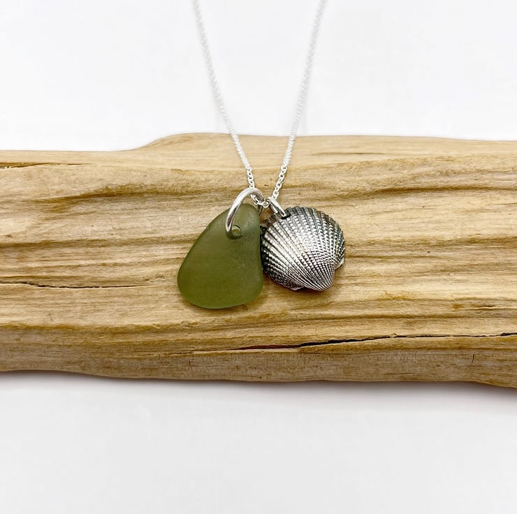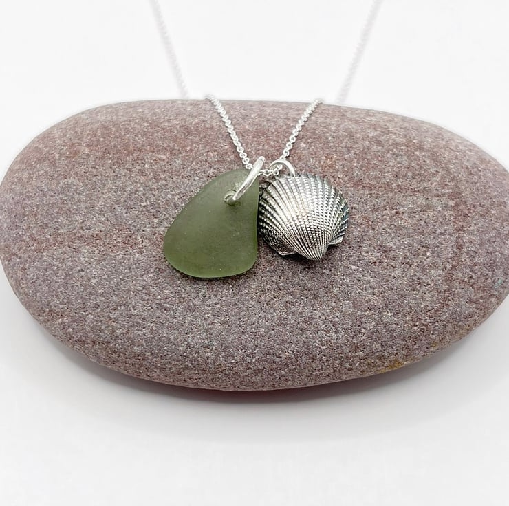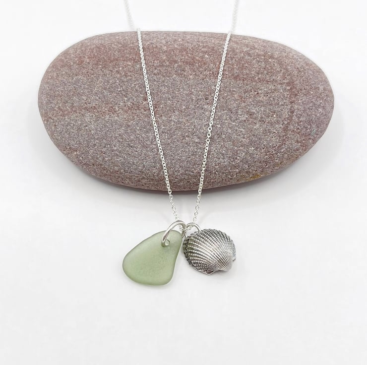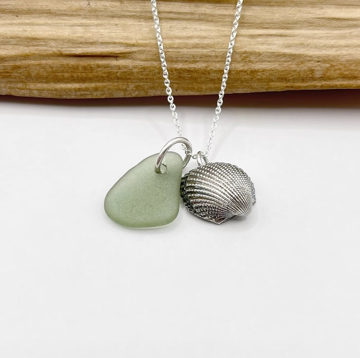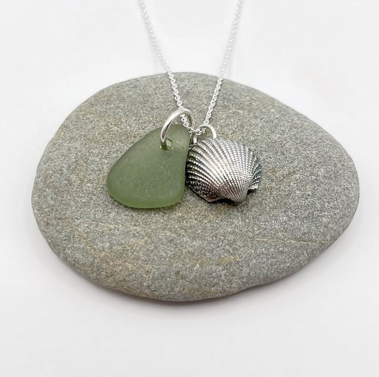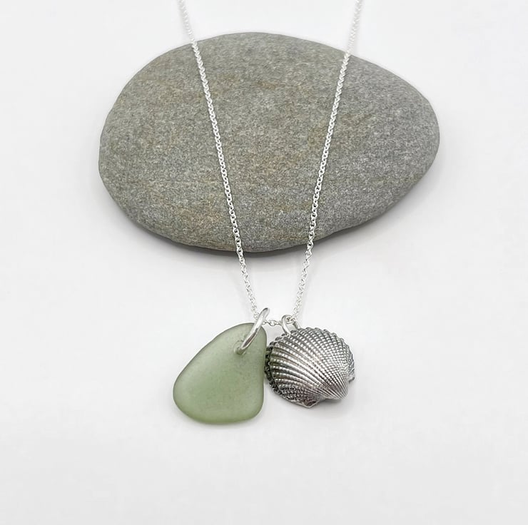 Cornish Sea Glass Necklace with Silver Coated Cockle Shell - Soft Green