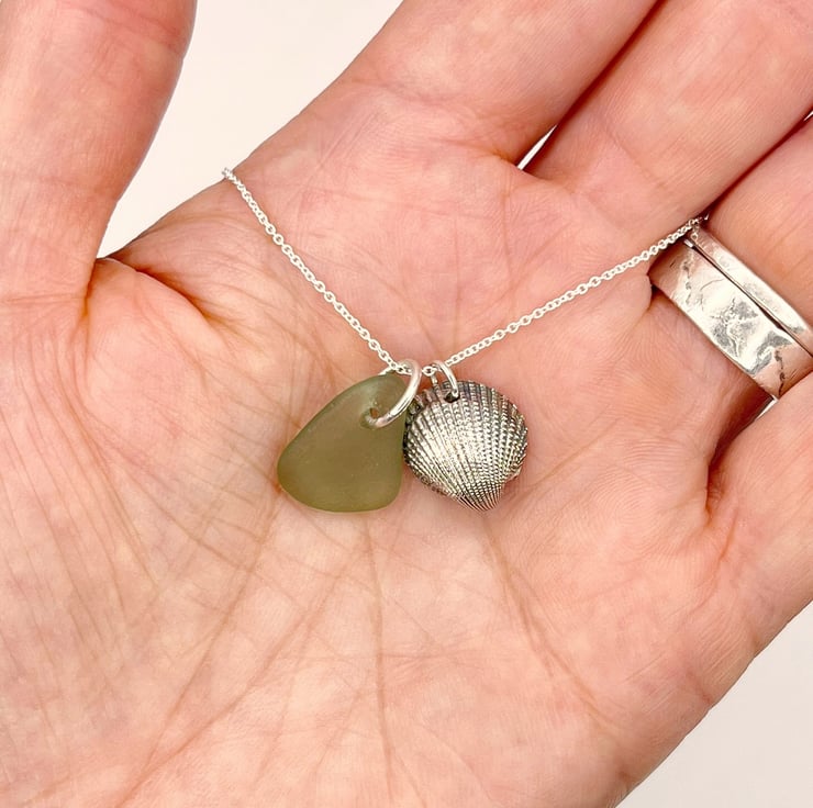 Silver coated Cockle Shell paired up with a piece of soft green coloured Cornish Sea Glass. I have added these on to an 18" Eco sterling silver fine chain necklace.