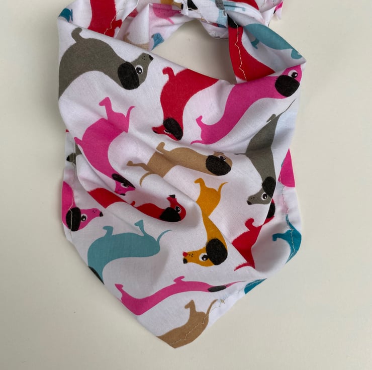 Daschund themed bandana. Strut your stuff in the park on Sunday and turn heads.