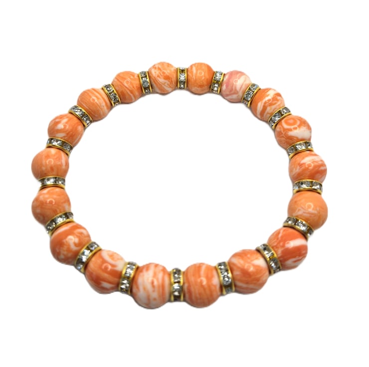 This stretchy bracelet is made with Rhodochrosite gemstone beads which are seperated by gold coloured faux crystal rondelles