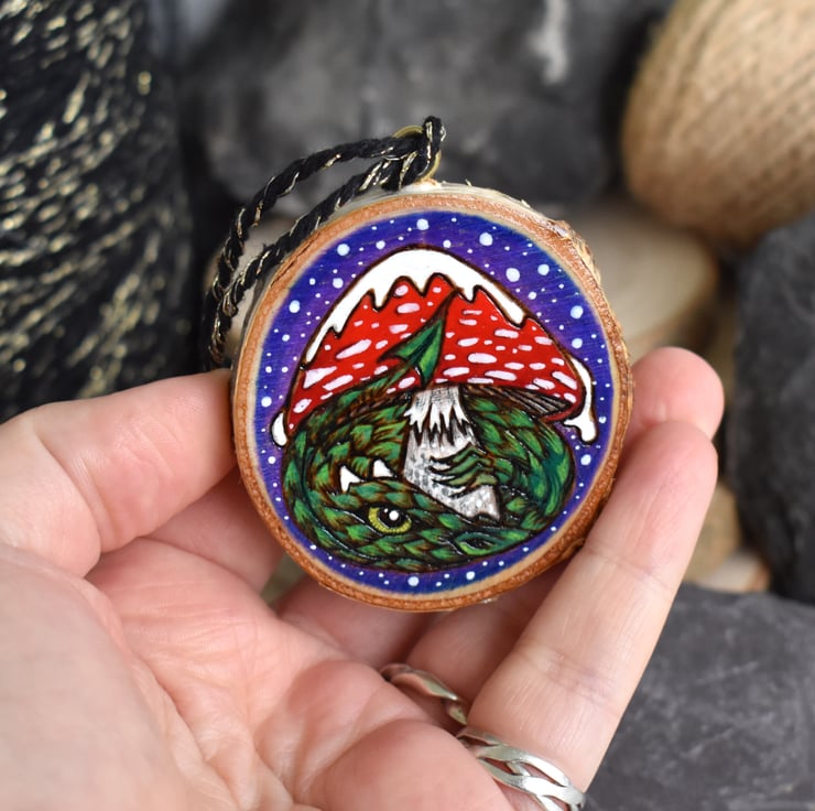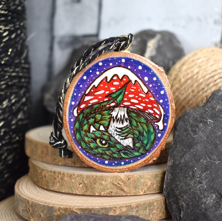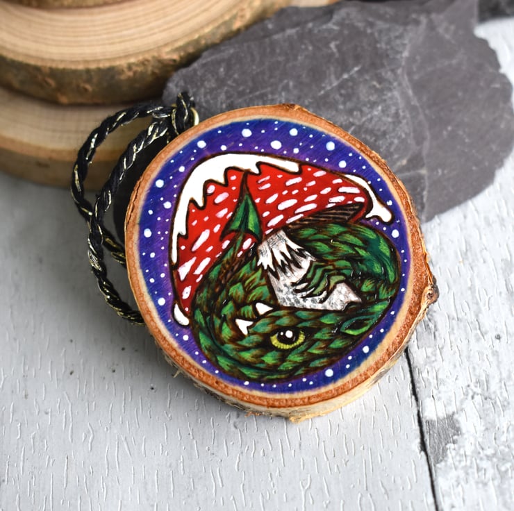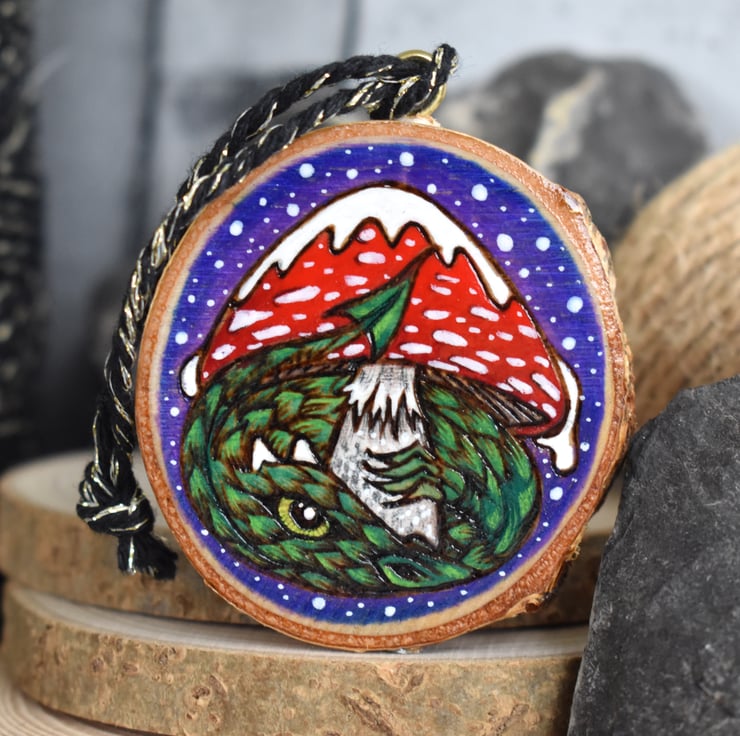 A hand burned pyrography wood slice decoration, with a dragon sheltering under a snow covered toadstool.