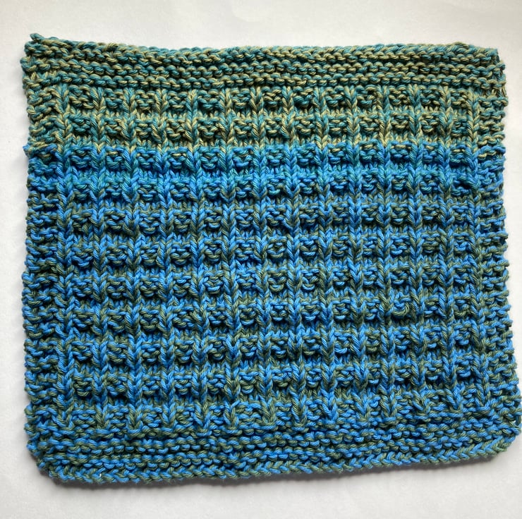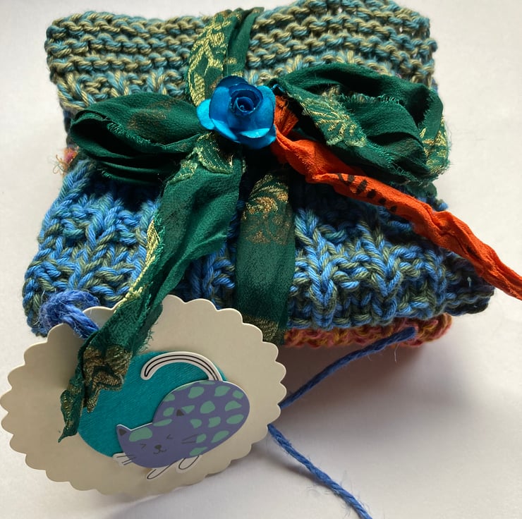 One is knitted in greens and blue and measures 22 cm x 23 cm