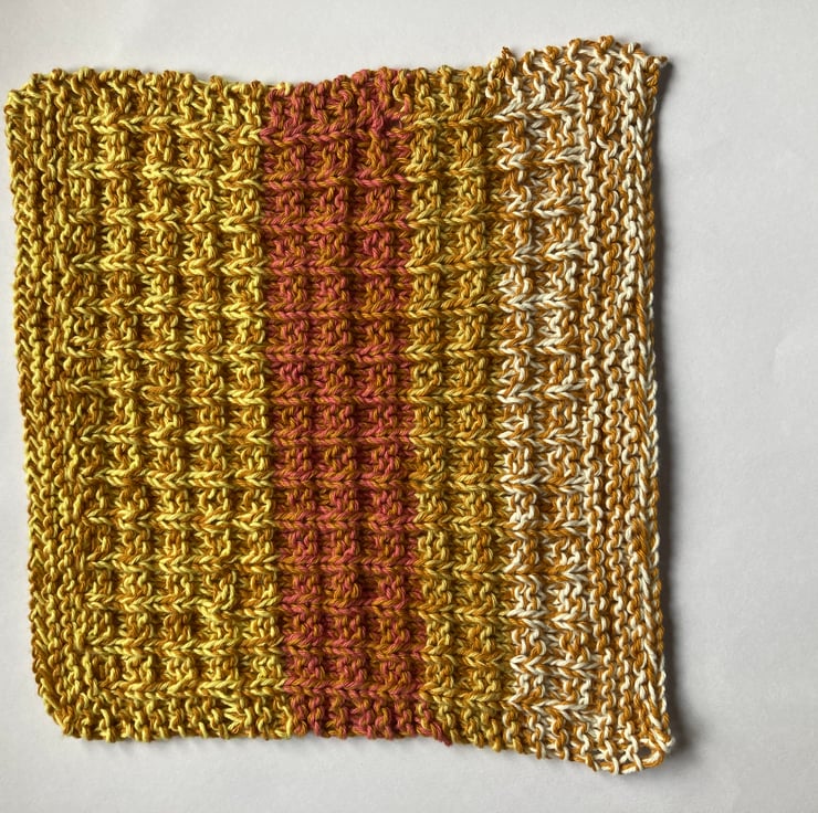 The other is knitted in mustard, yellow, salmon and off white.