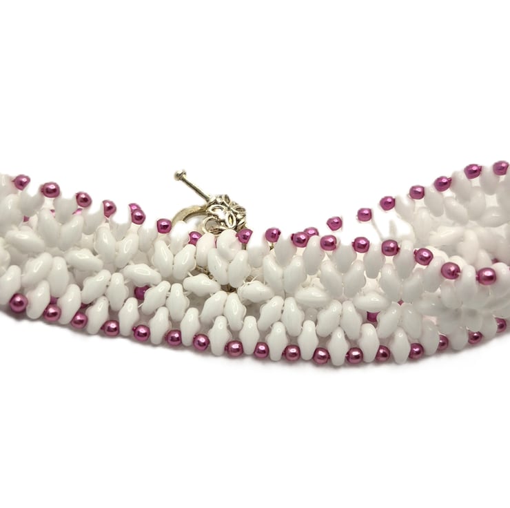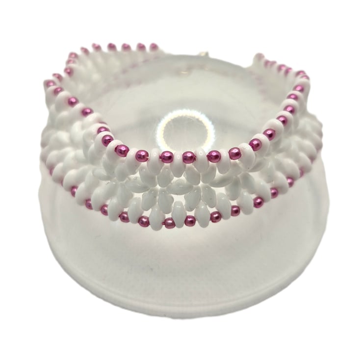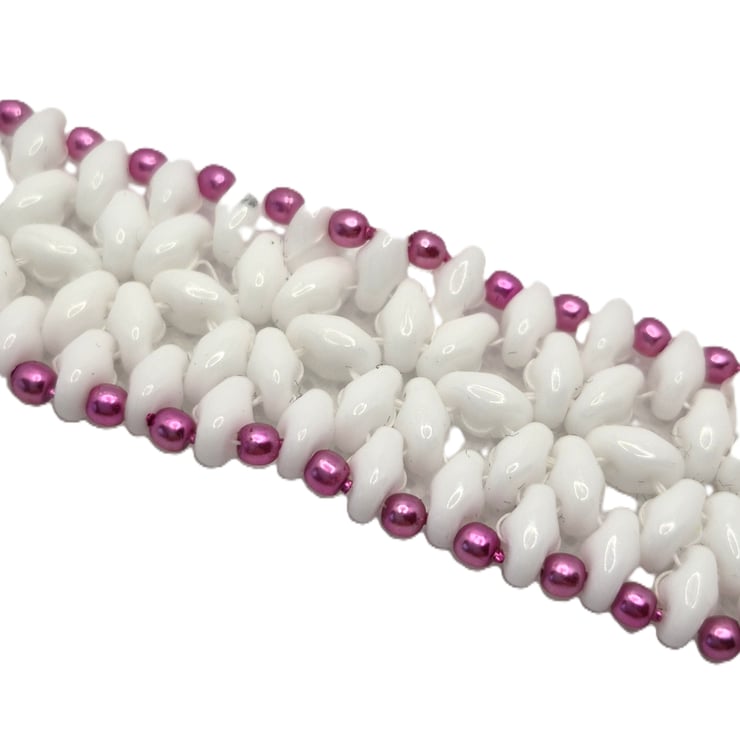 A beaded bracelet made with white superduo beads with an edging of pink faux pearls