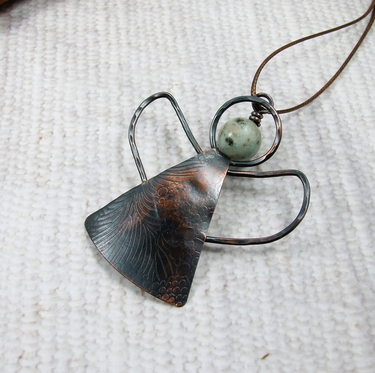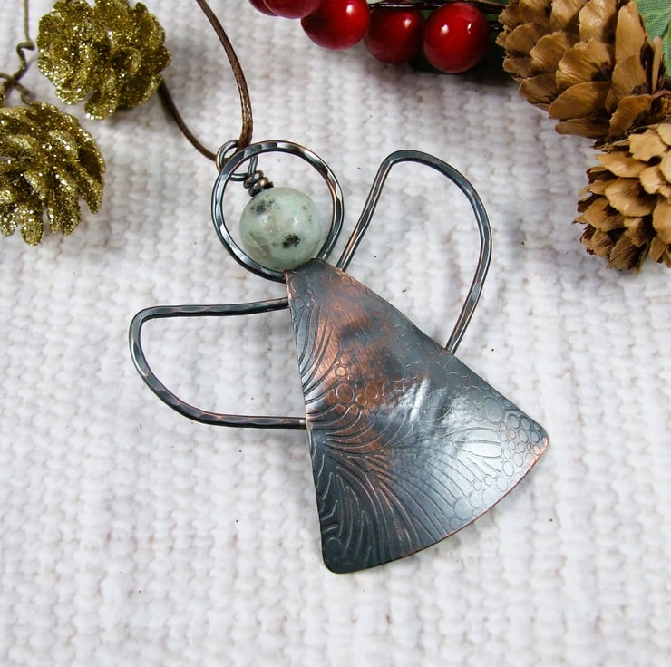 I have created the angel entirely by hand. The angel shape has been hand drawn onto copper sheet, cut out and embossed with a pattern. The wings and halo are formed from copper wire soldered onto the back and an extra wire has been soldered to affix the kiwi jasper gemstone which is securely wire wrapped in place. I have given the entire piece an antiqued finish and added some waxed cord for hanging.