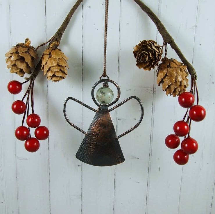 Angel hanging ornament, handcrafted in pure copper with kiwi jasper gemstone. Would also make a lovely Christmas tree decoration.