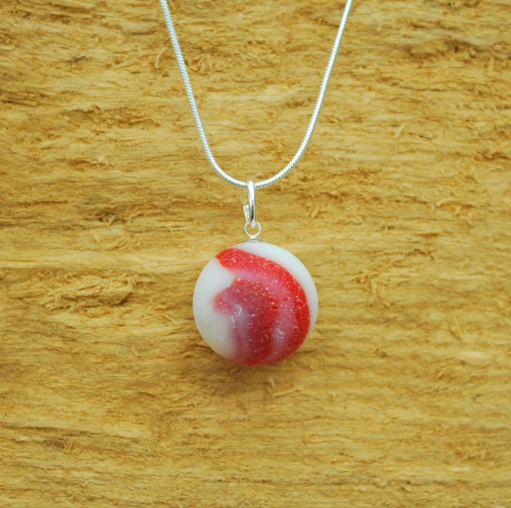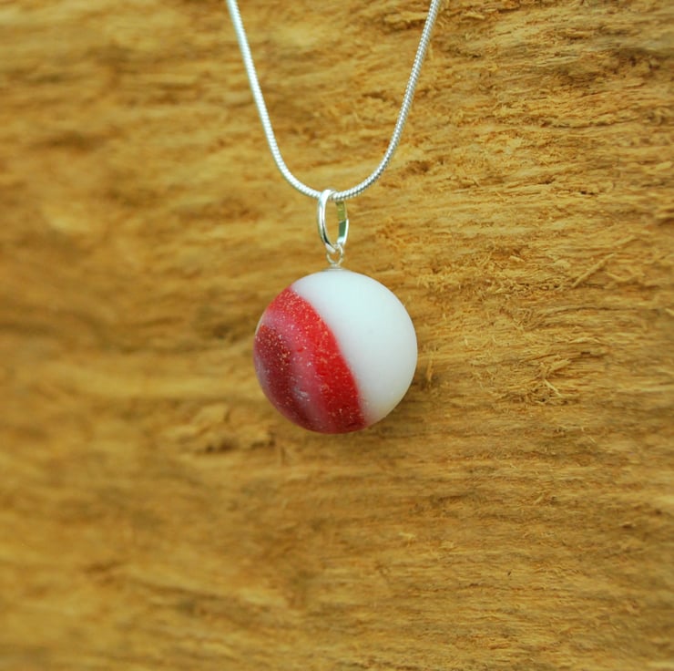Red and white sea glass marbles are extremely rare. This one is absolutely gorgeous, and finely frosted all over. To preserve the simple beauty of the marble we've pegged it and hung it from a sterling silver snake chain.