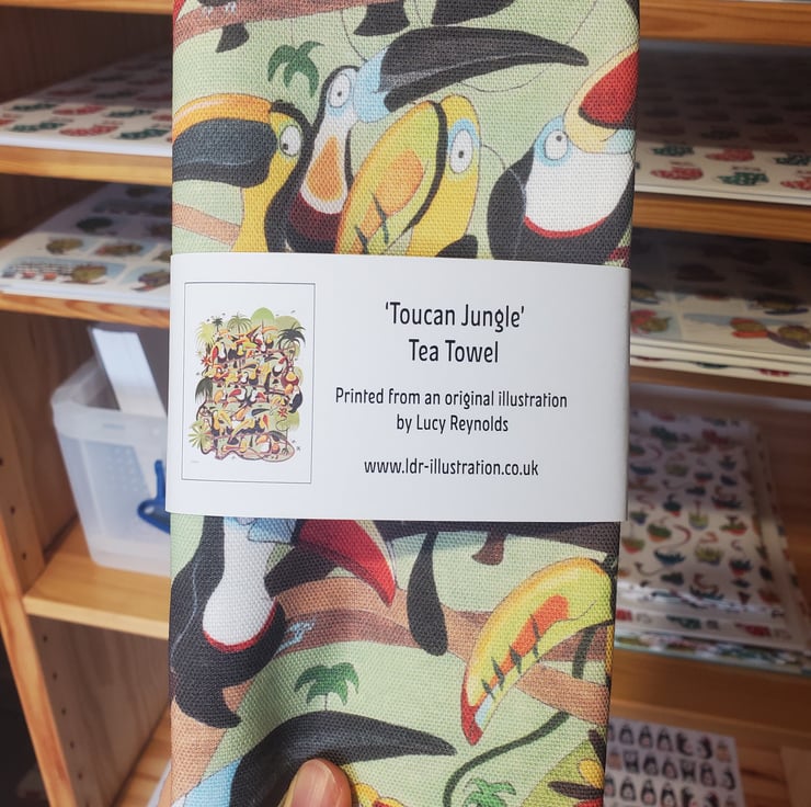 Cotton tea towel printed with my Toucan Jungle illustration.