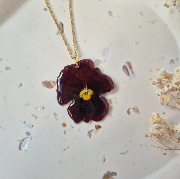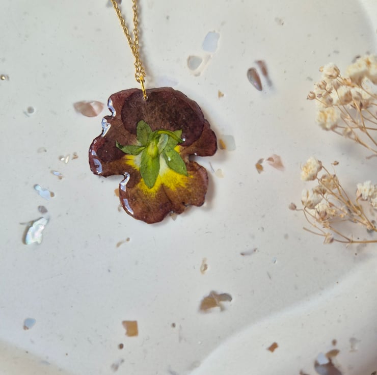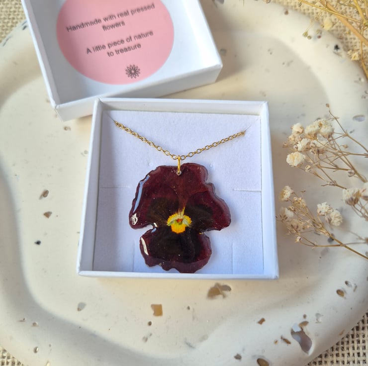 Capture the delicate beauty of nature with this handmade real pressed pansy flower necklace, featuring a genuine handpicked bloom preserved in layers of crystal-clear resin. Each pansy is carefully pressed and painted in translucent resin, highlighting its natural colours and intricate details.