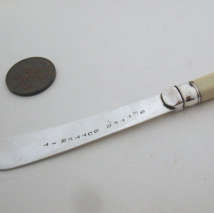A vintage butter spreader with a cream-coloured faux bone (i.e. plastic of some sort) handle and a silver-plated round-ended blade. I've hand stamped it with BETTER BUTTER IT. The lettering is somewhat wonky and runs vertically down the blade. Not my most successful prototype ever, also it has an orange mark on the back of the handle that I didn't notice before I started, so here it is in the bargain bin for a fiver while I hone my spreader-stamping techniques!