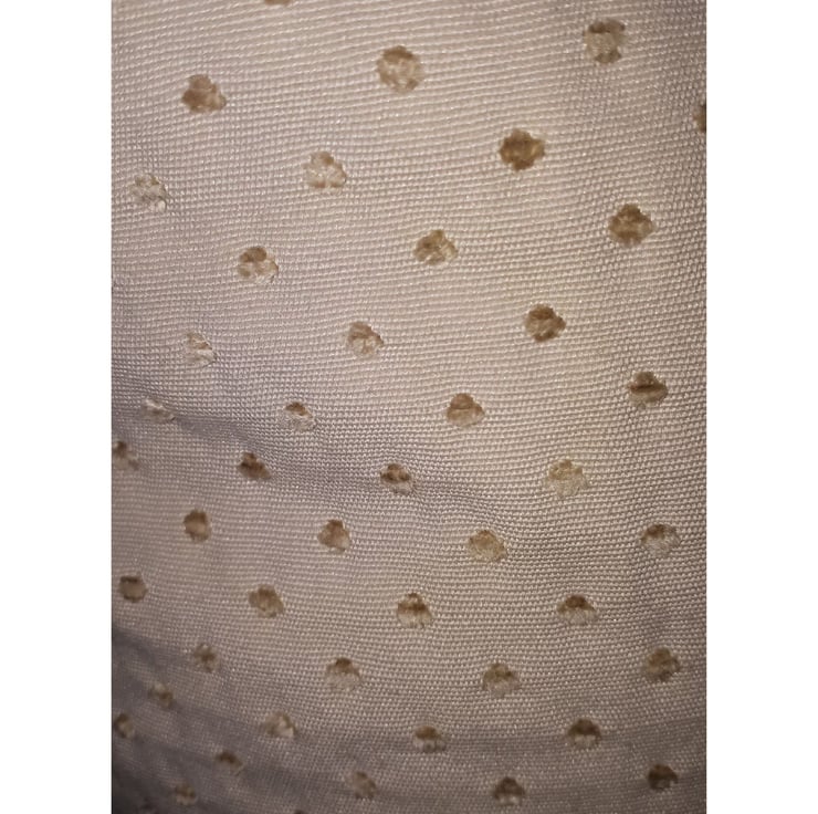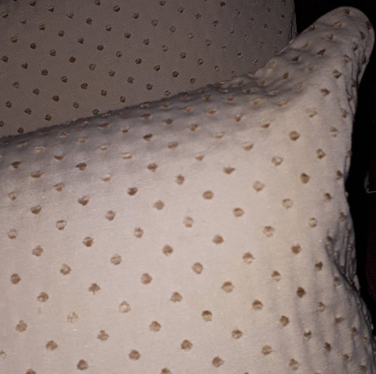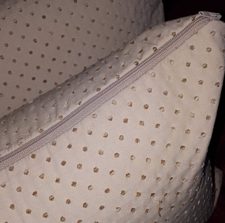 Cream / pale gold / honey colour chenille velvet like dobby weave spots (tiny tufted polka dots) fronts and backs and beige zips set in to the bottom edges.