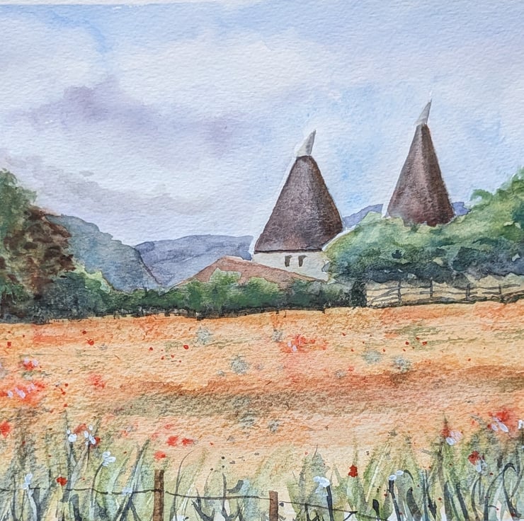 Watercolour landscape painting showing two oast houses behind a summer meadow with mount and simple white frame. A4 size