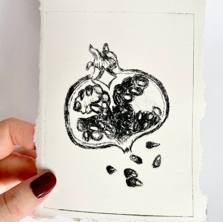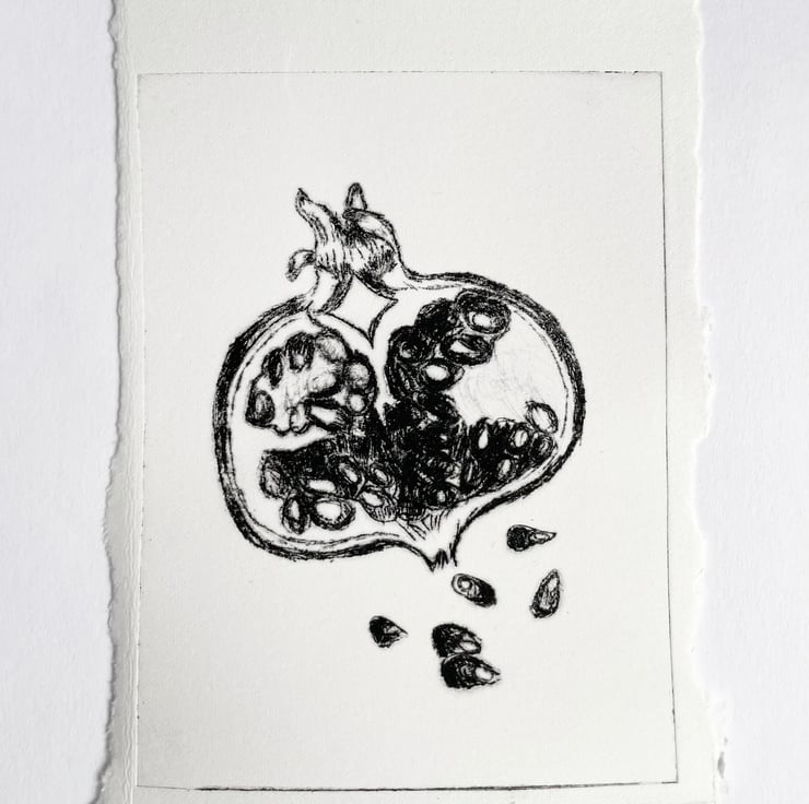 This is a black pomegranate illustration printed using the drypoint technique. The image depicts the inside of a pomegranate with some pomegranate seeds spilling out below. It is printed on an off white 285g Fabriano paper. The edges of the paper are hand torn. A6 size /15cm x 10cm / 6 inch x 4 inch. (Approximate measurements)