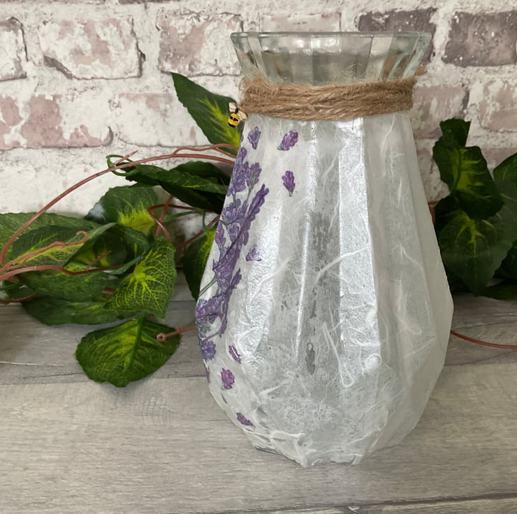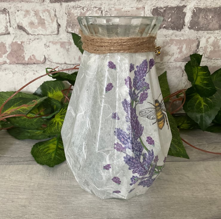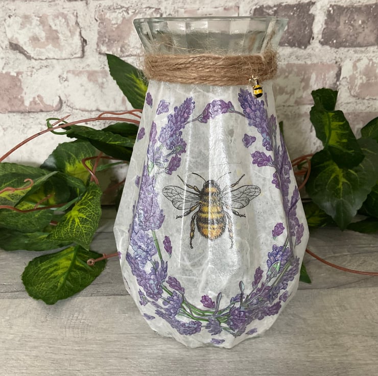 Glass Vase. Floral Lavender Bee. Decoupaged.