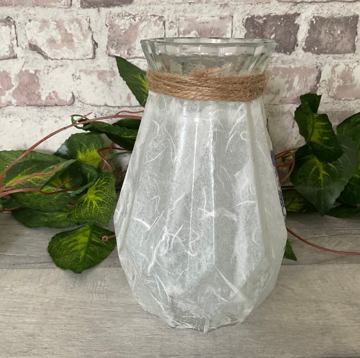 Ribbed glass vase, covered in straw silk paper with image decoupaged.