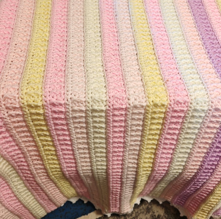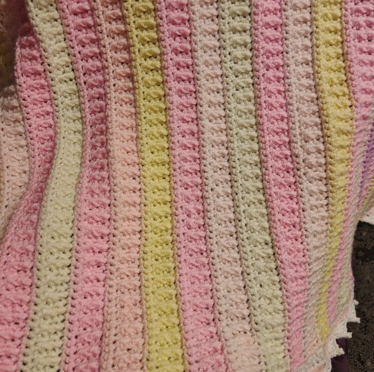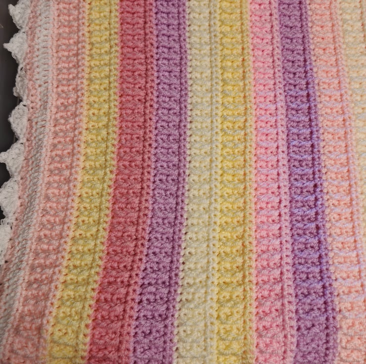 Absolutely gorgeous candy stripe baby girl blanket in stunning shades of pink, purple and yellow. This blanket will be cherished by your loved one and is a must have for any nursery/bedroom, from moses basket to cot bed.