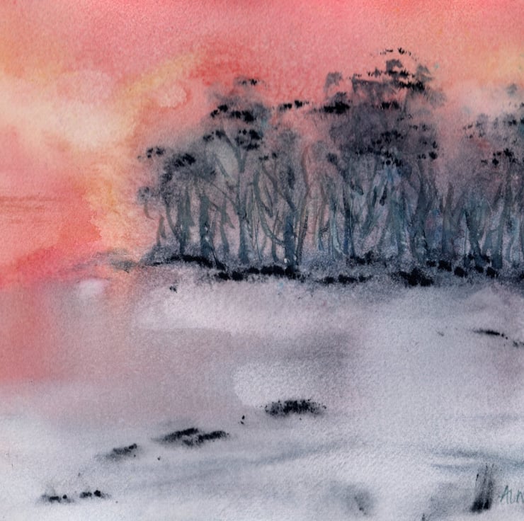 Watercolour landscape of a clump of trees seen in the evening light of the winter sun with snow on the ground. Mounted and presented in a simple white frame. A4 size.