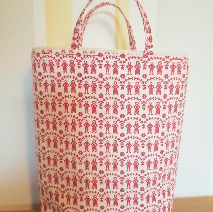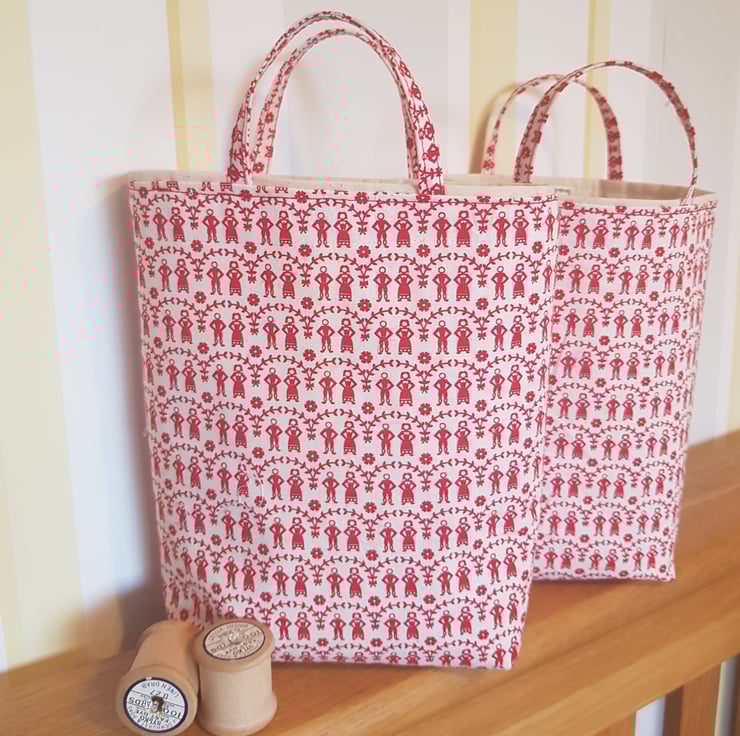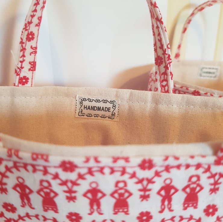 Sustainable and reusable, this little bag is ideal for popping in a small gift, or two. It measures approx 7" x 7": 18cm x 18cm and 2" , 5cm at the base. I have chosen a good quality cotton fabric , the bag is lined with cotton calico and is interfaced with a recycled interfacing so it won't flop.