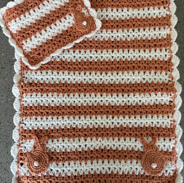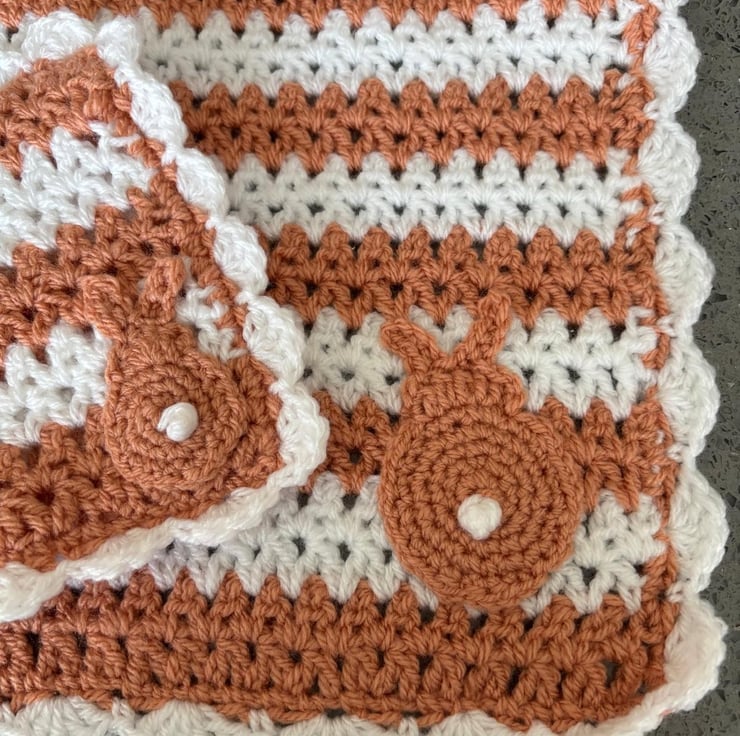 This is a set of a crochet blanket and pillow for a doll. The yarn is a lovely peach/ pale brown colour and white. The bottom corner of the blanket and one corner of the pillow is embellished the back view of crochet rabbits which have white tails. The pillow is padded out with pale pink fleece. The picture shows the blanket with a 16" )41 cm) doll. The sizes: Blanket 45 x 35cm. the pillow 17 x 20cm. A sweet gift for Xmas or a birthday.
