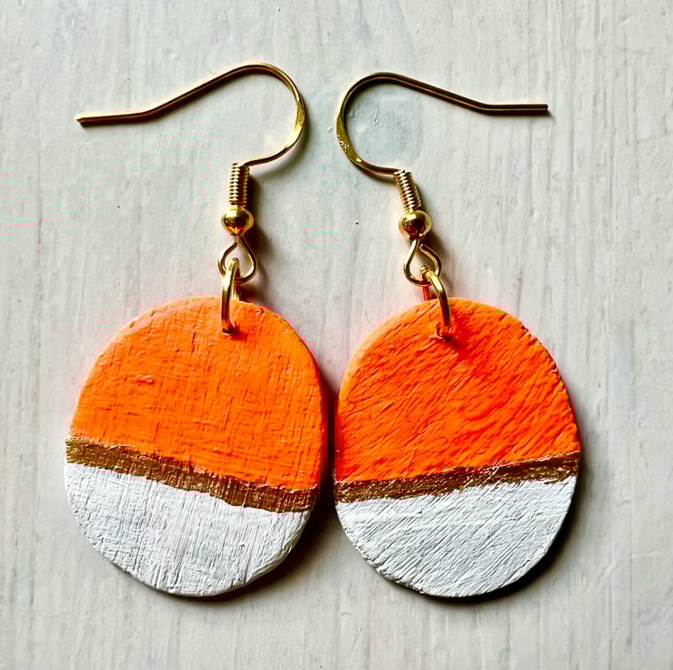 Retro style wooden earrings orange, gold and white with gold-plated hooks