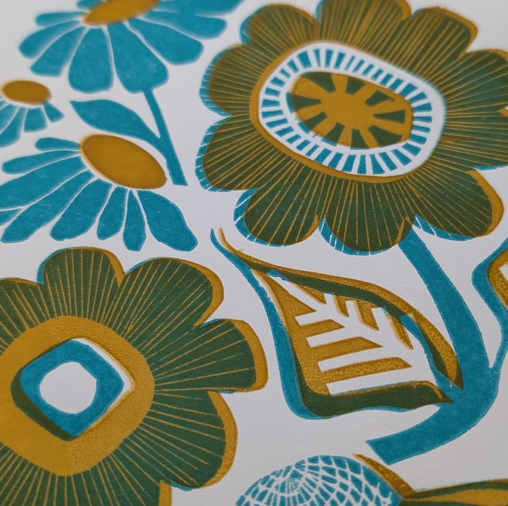 Handmade original Linocut printed onto off-white 190gsm acid-free paper using gorgeous vibrant Cranfield inks.