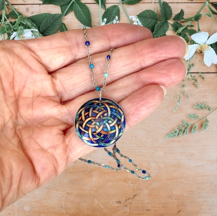 This necklace has a domed round pendant which I have handmade, with a blue orange green timeless Celtic knot design, symbolising everlasting love and happiness. Lightweight and easy to wear, also matching earrings are available - please ask.