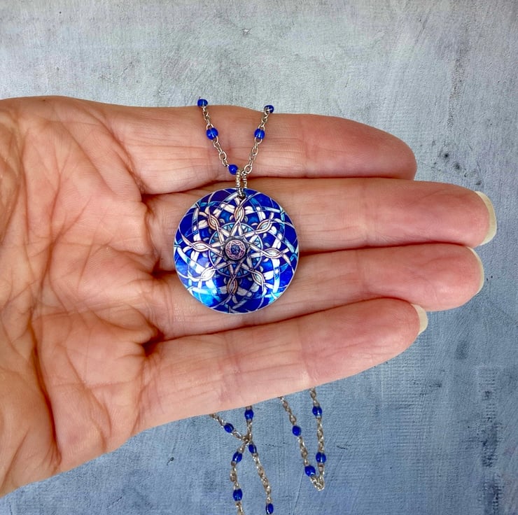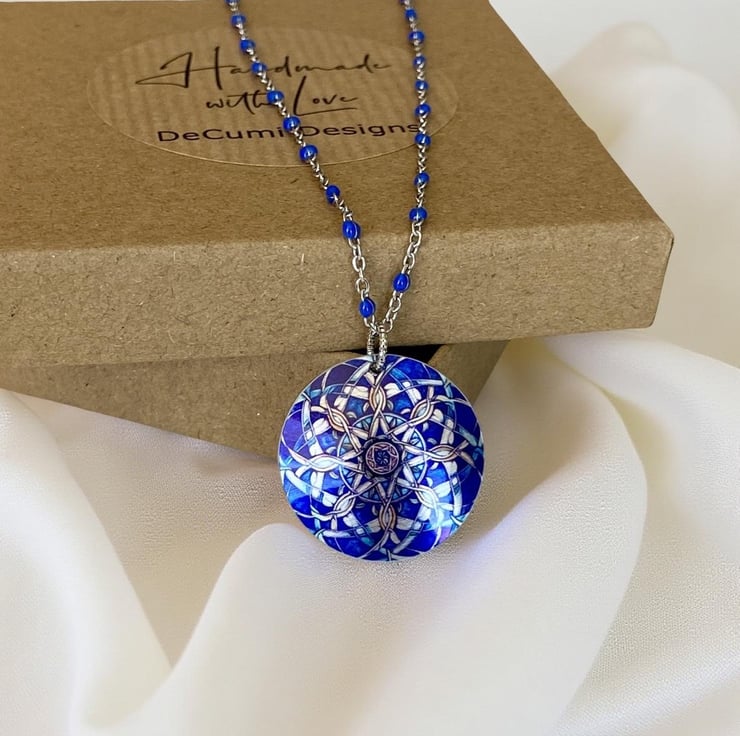 This necklace has a domed round pendant which I have handmade, with a dark blue timeless Celtic knot design, symbolising everlasting love and happiness. Lightweight and easy to wear, also matching earrings are available - please ask.