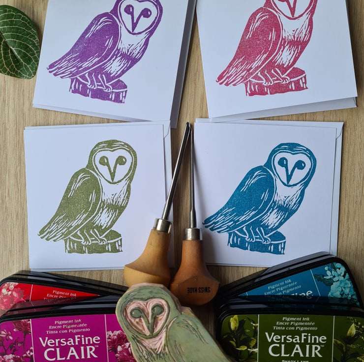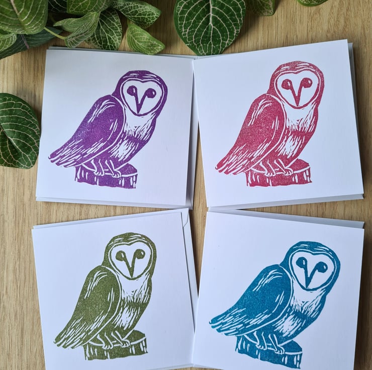Pack of four notecards with envelopes - all handprinted with a pretty owl rubber stamp which I have designed and carved, and using quality ink pads. Also available with gift wrapping in a separate listing - see 'notecards and thank you cards' collection.