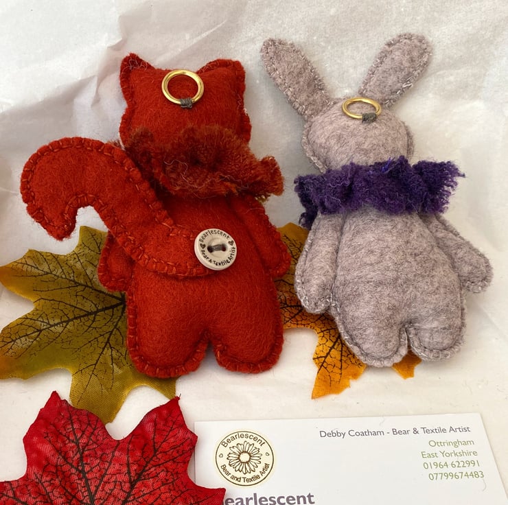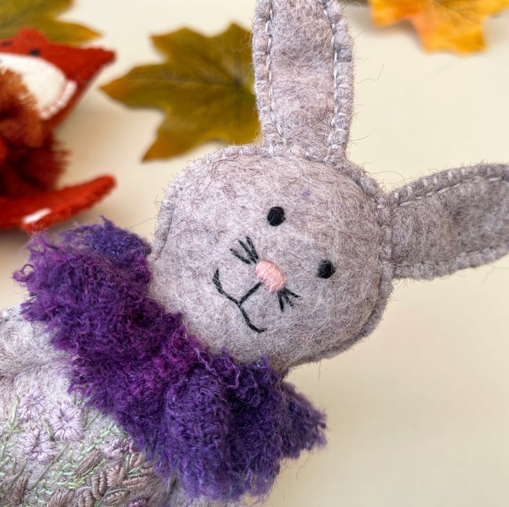 Rabbit has been hand sewn in the same way onto 100% wool felt in thistle marl. She measured 4.5" tall x 2.5" wide.