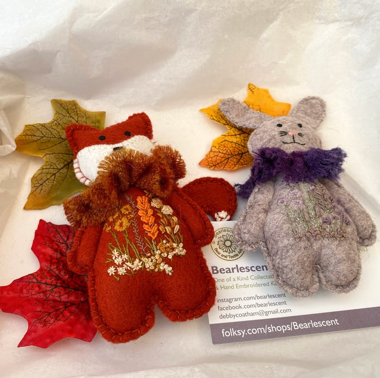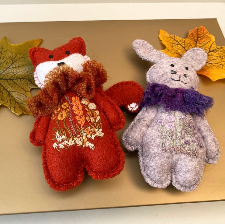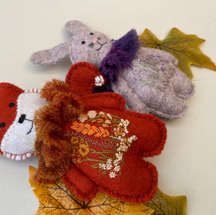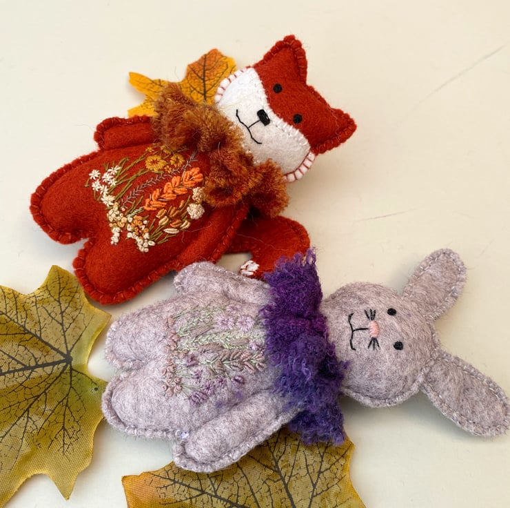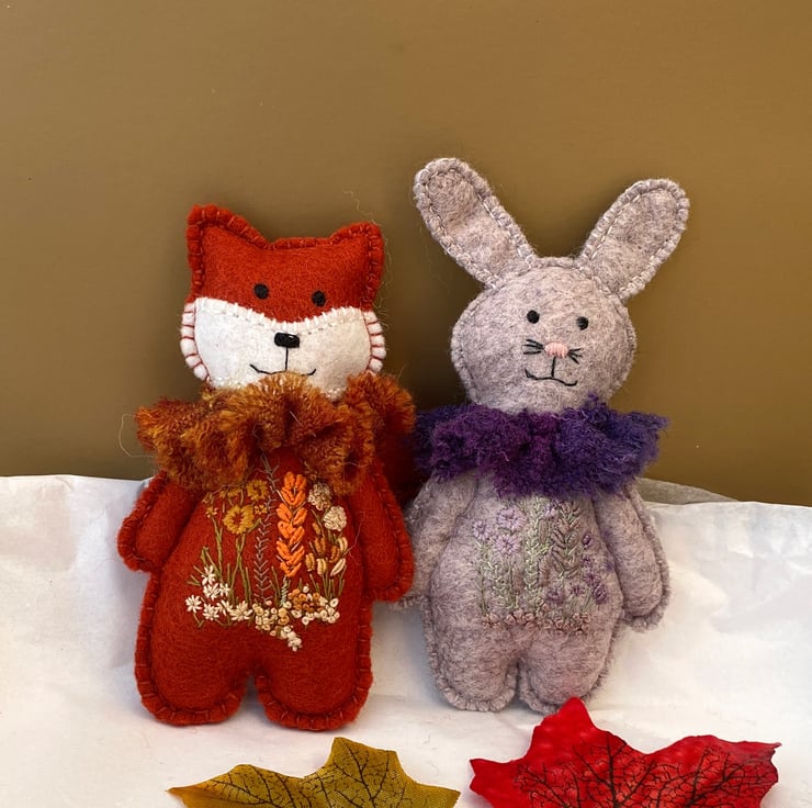 Reduced size fox with all the same qualities of his larger friends but measuring 4" tall x 2.5" width. Triple hand sewn seams for stability and decoration, he has been created from 100% wool felt in paprika and has a hand embroidered floral scene to his body front using various stitches and dmc threads in oranges, mustards, naturals and greens.