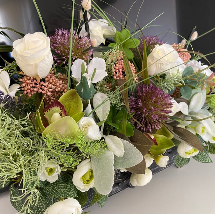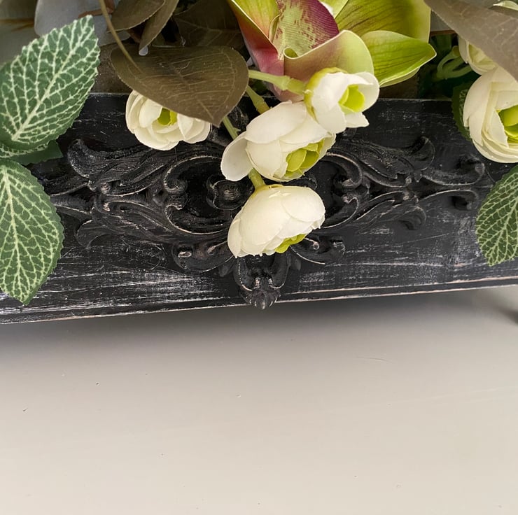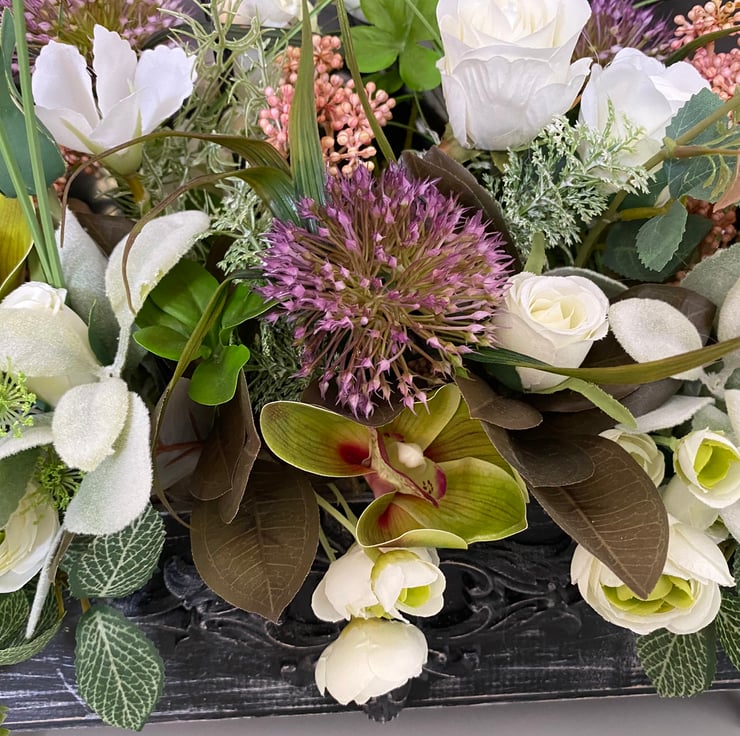 This is a artificial flower arrangement set in a wooden box with wooden embellishment and decorative feet. These flowers will provide year round interest. A perfect gift that will brighten up any mantle piece, window sill etc.