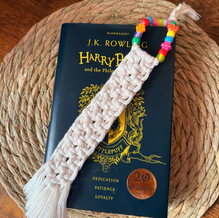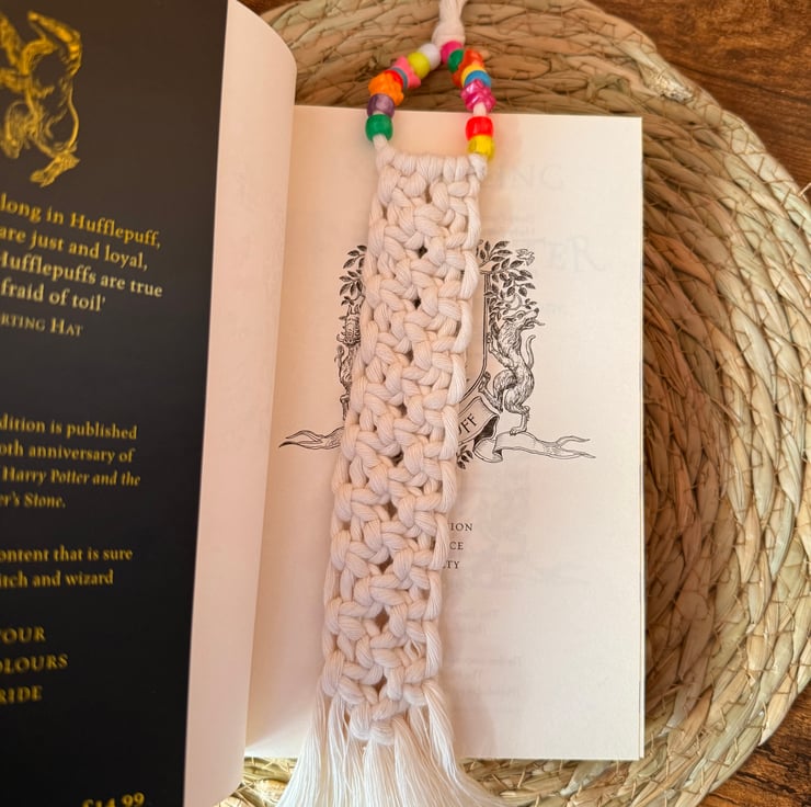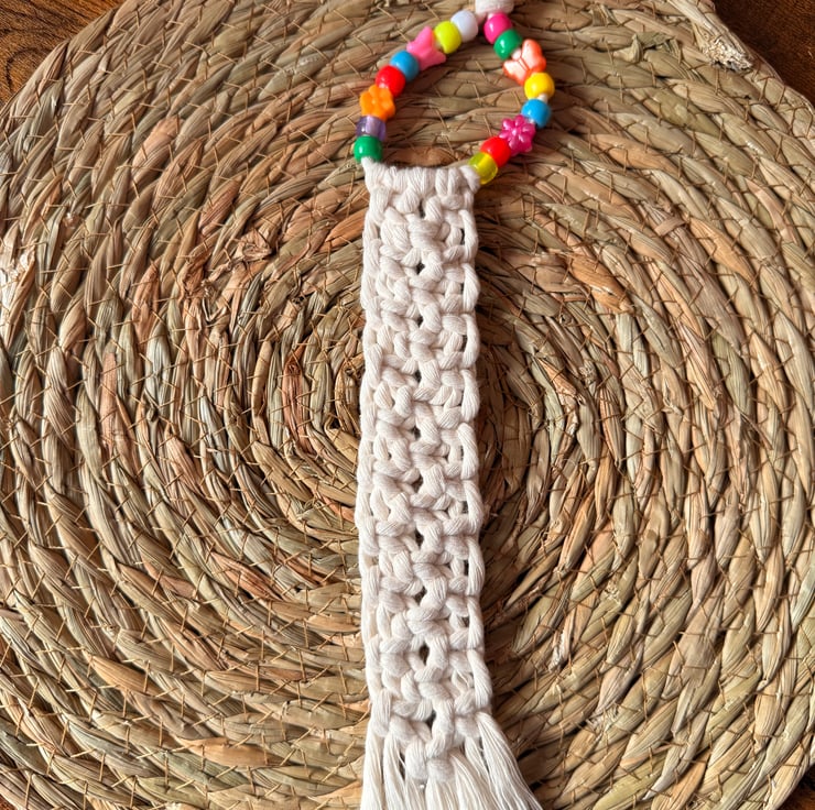 A sweet handmade children’s bookmark crafted from 100% natural cotton cord and finished with bright cheerful beads and a soft fringe. A fun practical gift for young readers of primary age.