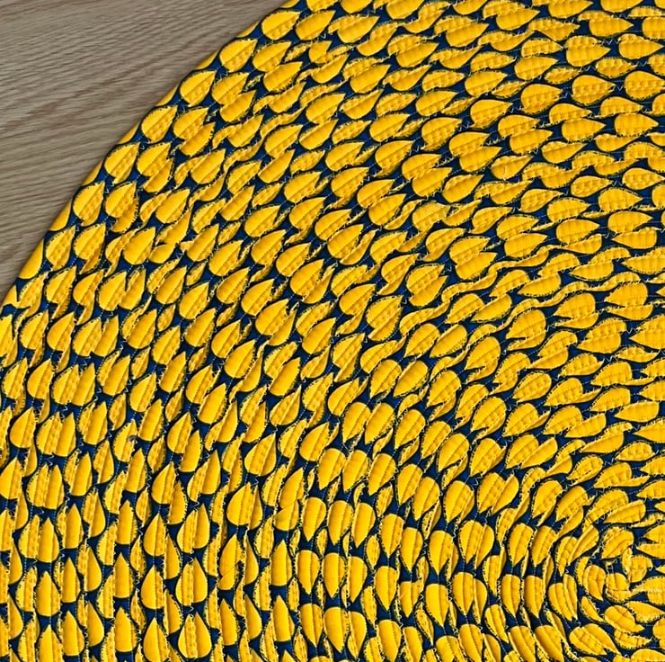 Why not add a splash of colour to your home with this handmade round Orange Drop jelly roll rug. The fabric is a waxed cotton fabric of orange, black with a hint of blue. The diameter of the rug is 36.5 inches.