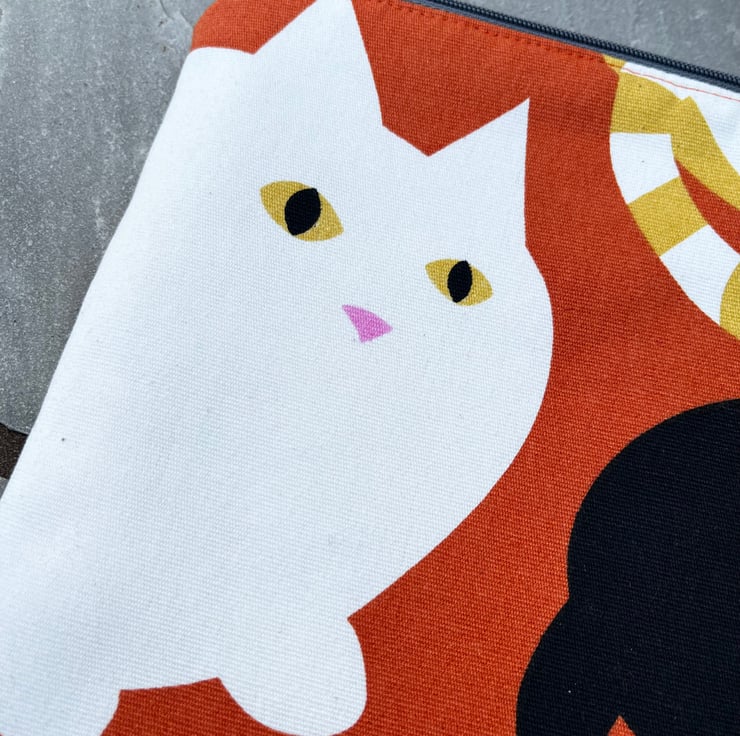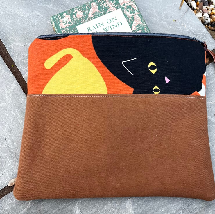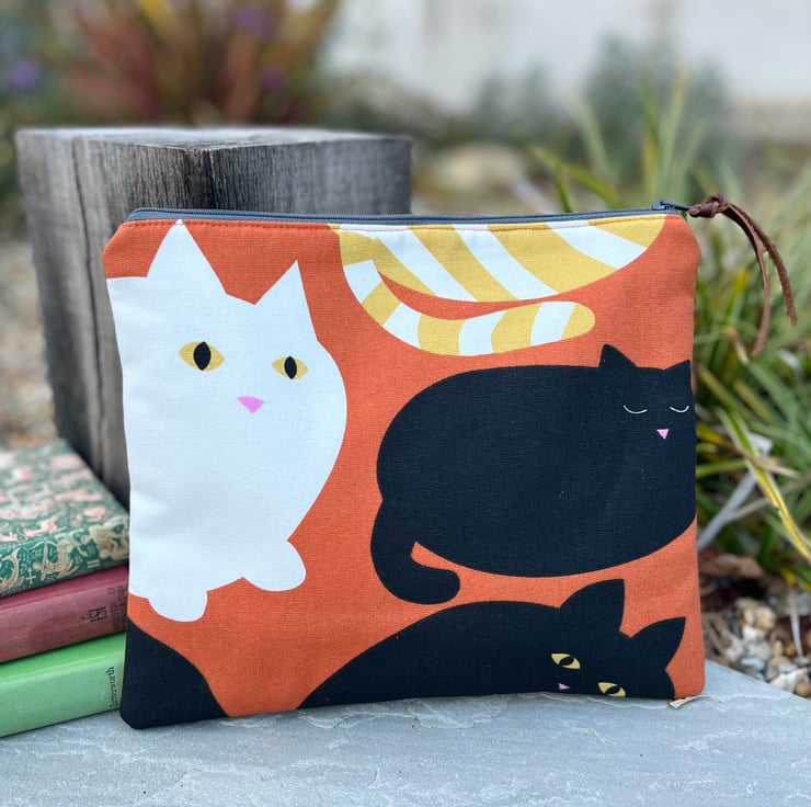 One of a kind soft zip pouch made from IKEA cotton with a cat print and a soft tan sample swatch of fabric. It is fully lined with more sample swatch fabric. The pouch is a great size for a paperback book, purse and phone. It could also be used for small craft projects or cosmetics.