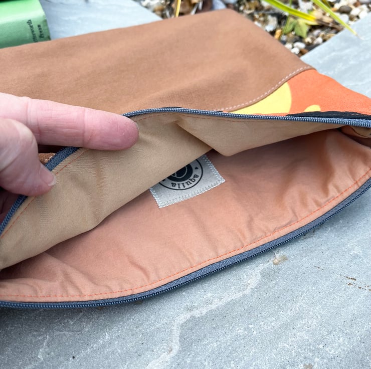 The pouch is fully lined and softly padded with reclaimed interlining from old curtains. The leather zip pull is a strip of leftover leather from a local upholsterer. This can be changed for ribbon if preferred.