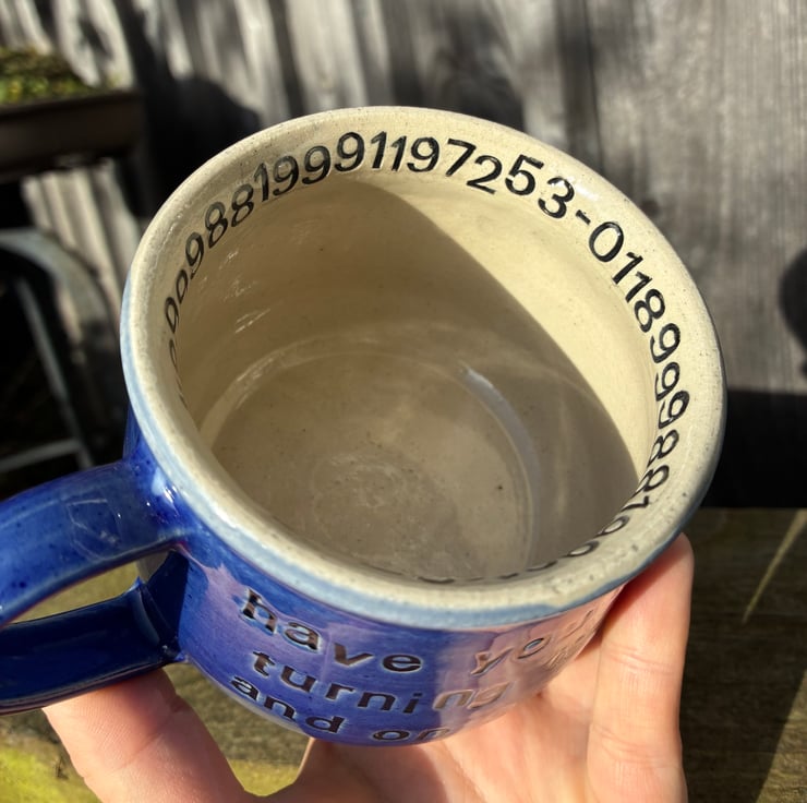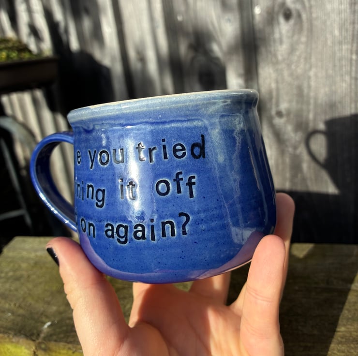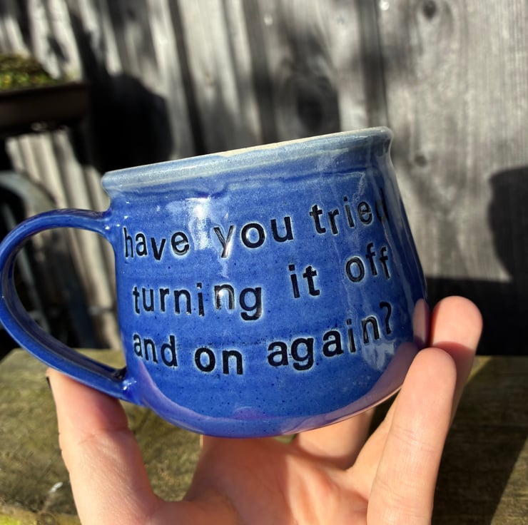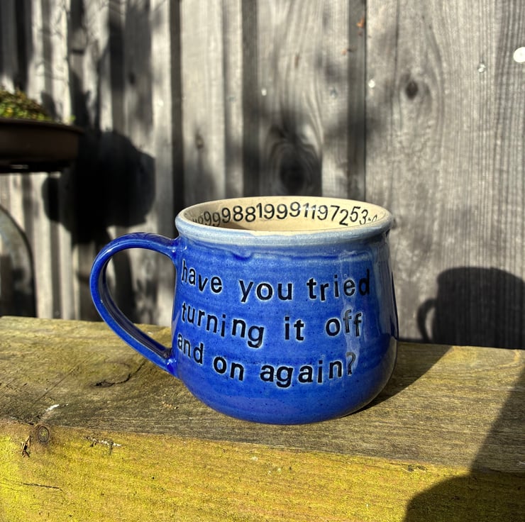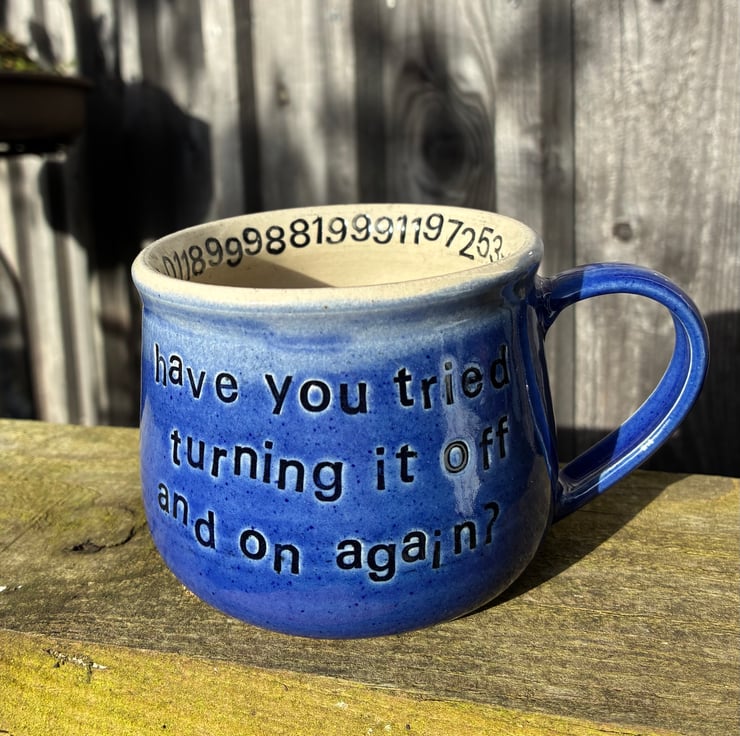 Inspired by choice phrase from British TV series, this mug is stamped on both faces with the words "Have you tried turning it off and on again?". Lettering is inlaid underglaze, and the inner rim is decorated with numbers.