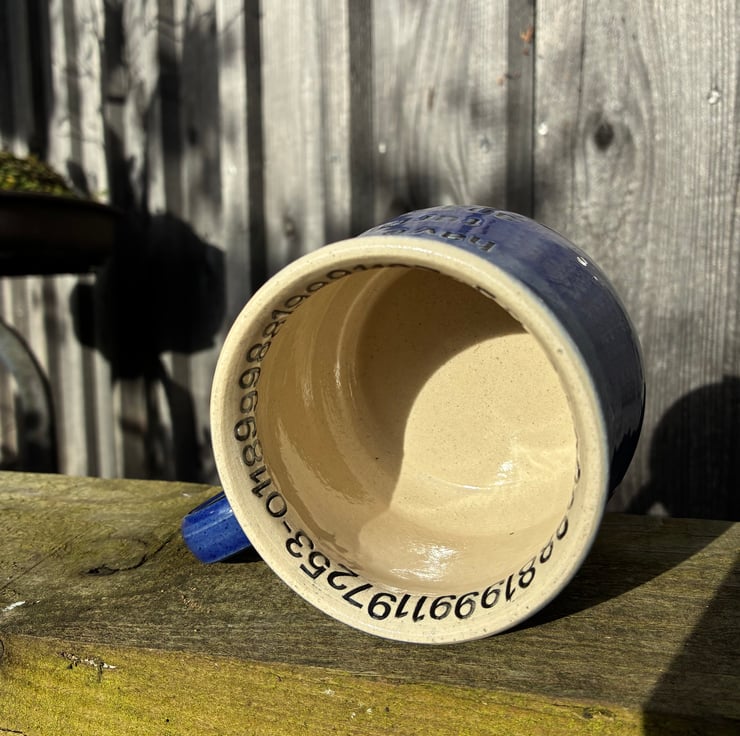 This mug is a misprint and an intial tester of a glaze, which came out a slightly uneven deep blue. I forgot to stamp the letter D on one side, as photographed you can see it has been added in underglaze but isn't textured. The price reflects its imperfect nature, but it is otherwise fully functional and finished.