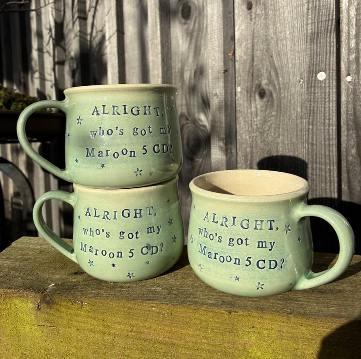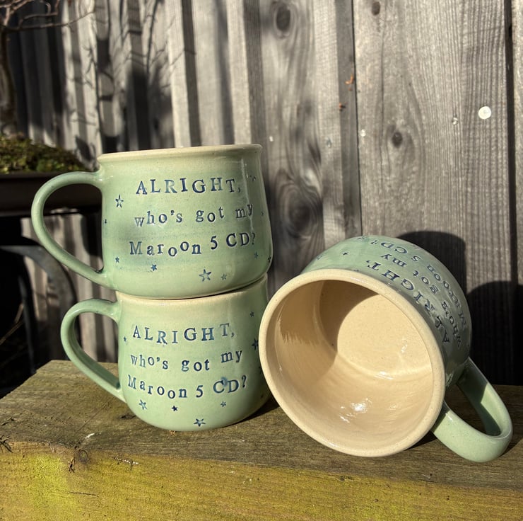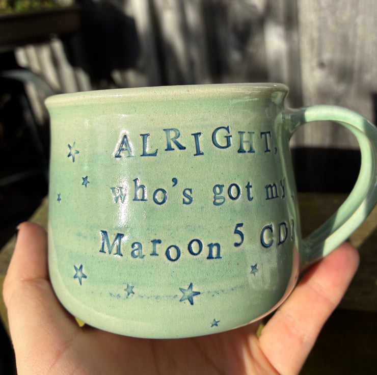 Inspired by Tracey Beaker's Rio Wellard, this mug is stamped on both faces with the words "ALRIGHT, who's got my Maroon 5 CD?". Lettering is inlaid with blue underglaze, and covered in a minty green glaze.