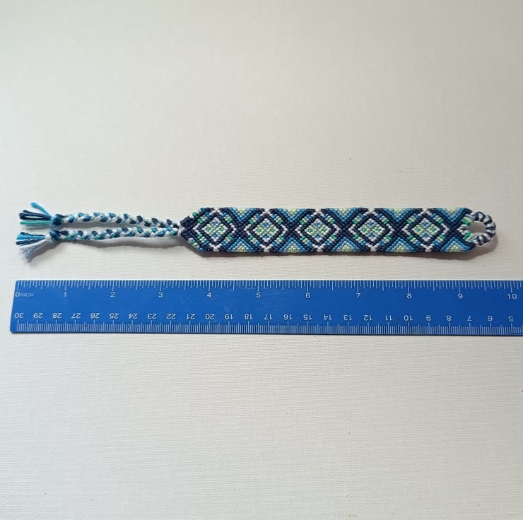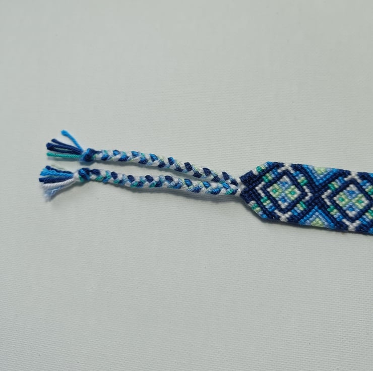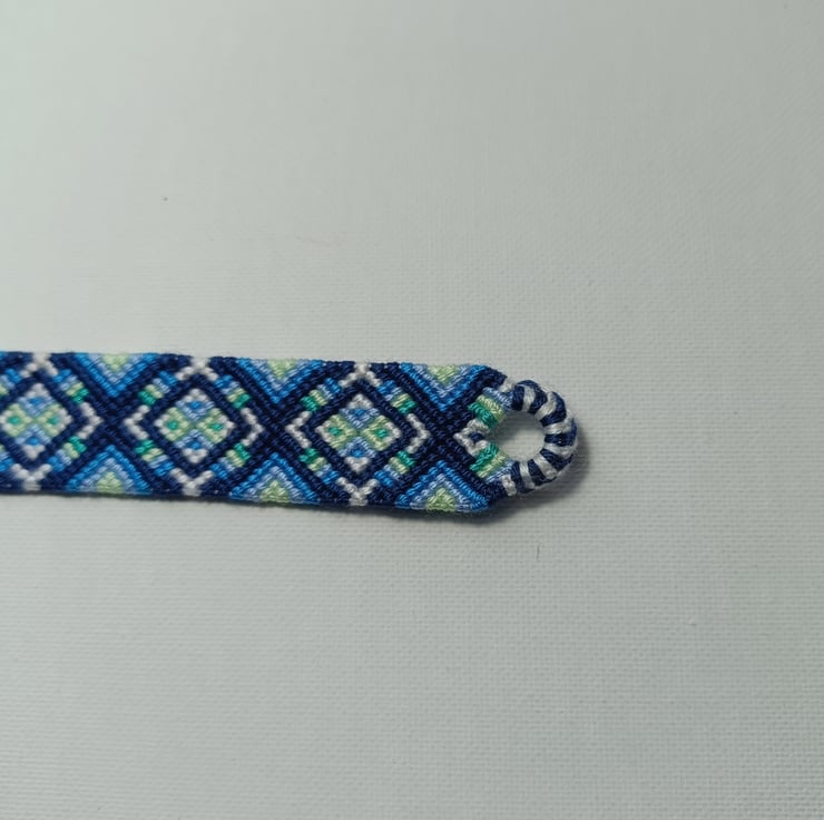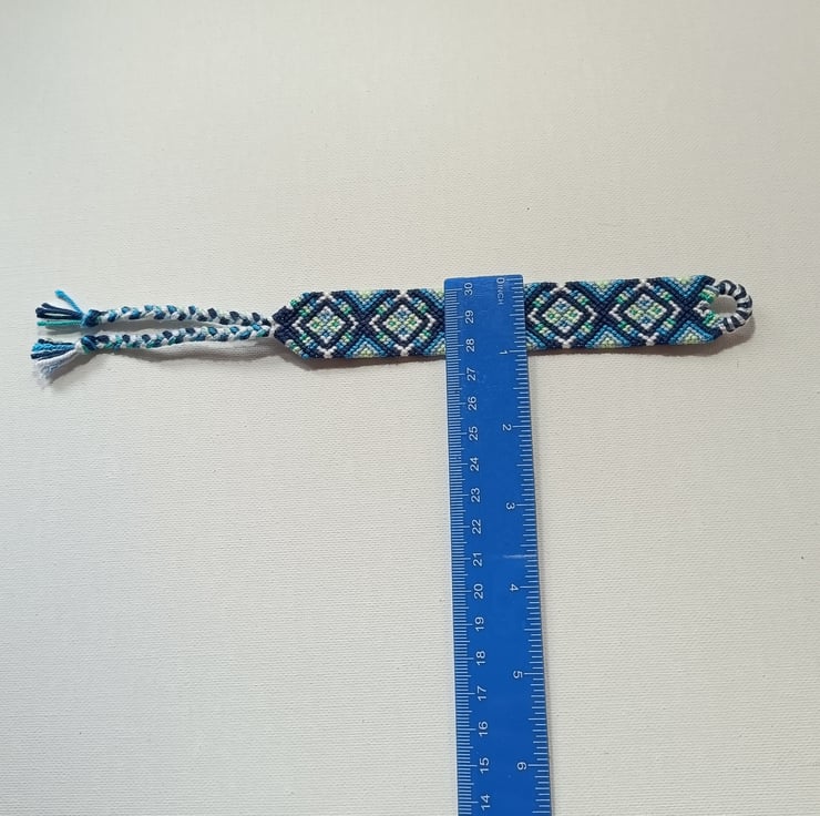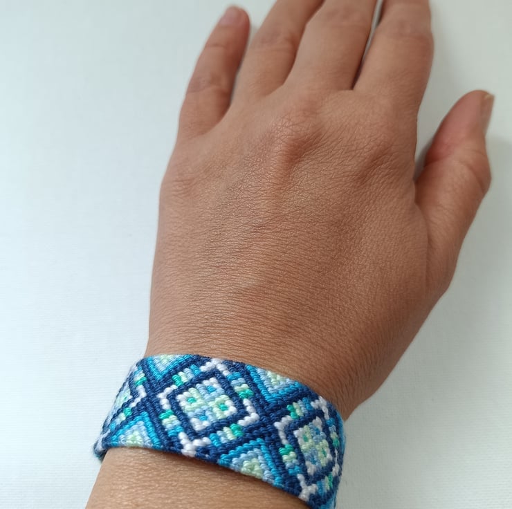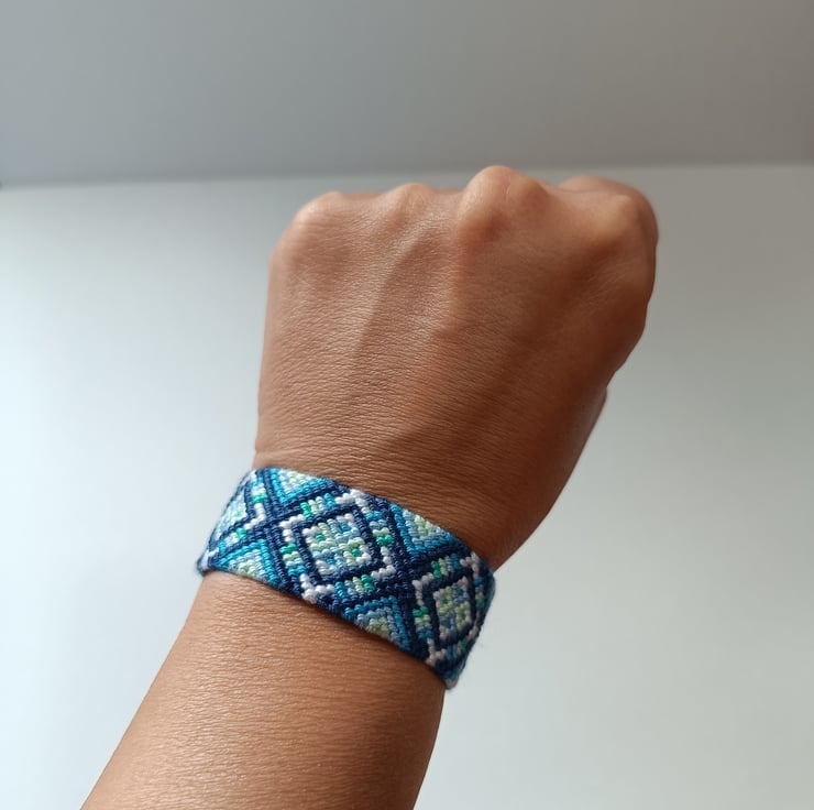 Crafted from high-quality cotton embroidery threads in rich shades of green, black, and white, this adjustable bracelet features a bold geometric diamond pattern. Each piece is carefully knotted by hand using traditional macramé techniques, making every bracelet unique.