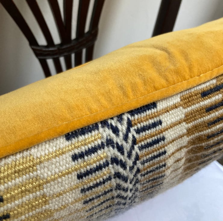 Finish: the back of cushion has a vibrant gold coloured velvet, with zip and has the same gold coloured velvet piping all around the outside edge. Completed with a good quality feather cushion pad.