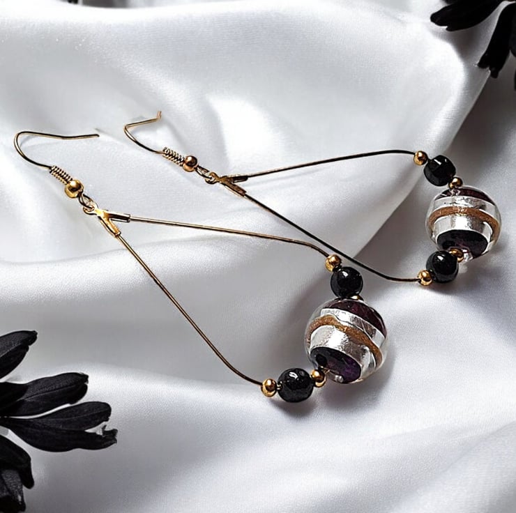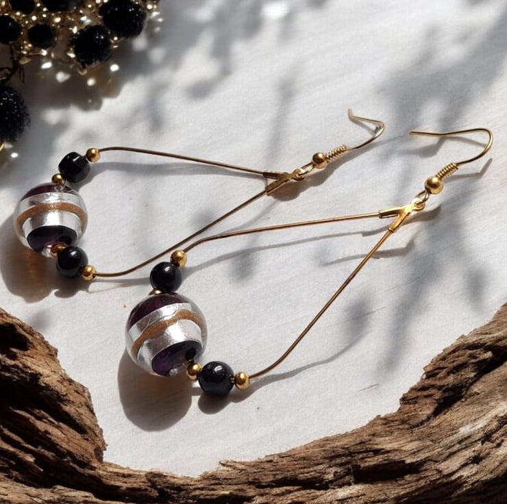 Stunning silver and gold foiled Murano glass beads accented by smaller black glass beads, on a gold plated teardrop earwire
