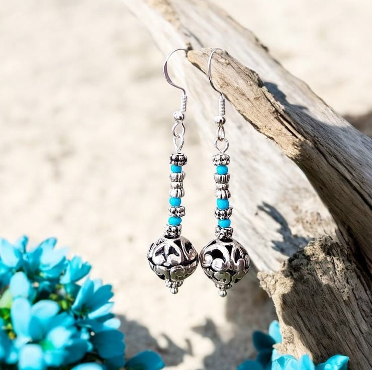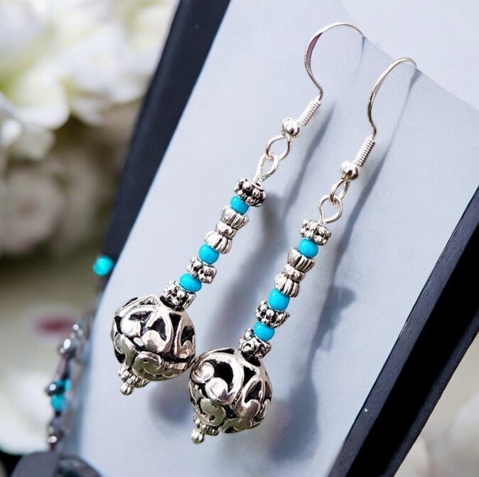 Elaborate Tibetan filigree beads matched up turquoise beads on Stirling silver ear wires