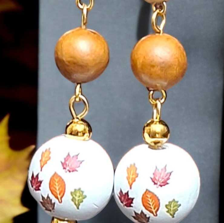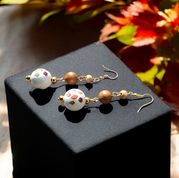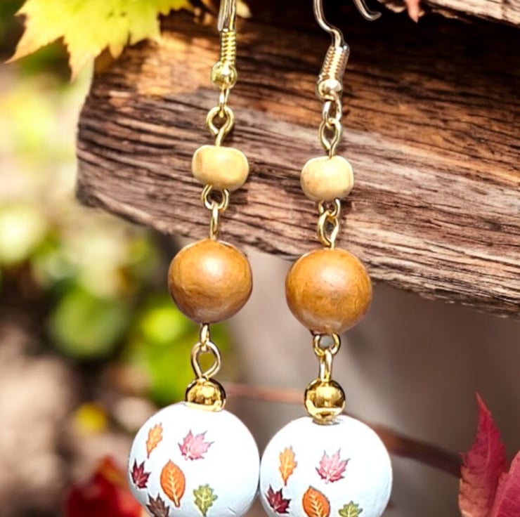 Autumn leaves designed earrings. Made from sustainable wood beads. 16 mm large bead, 10mm medium bead and 6 mm small bead. They have a drop of 70mm including the earwire